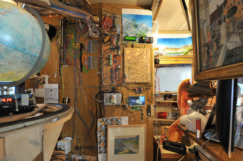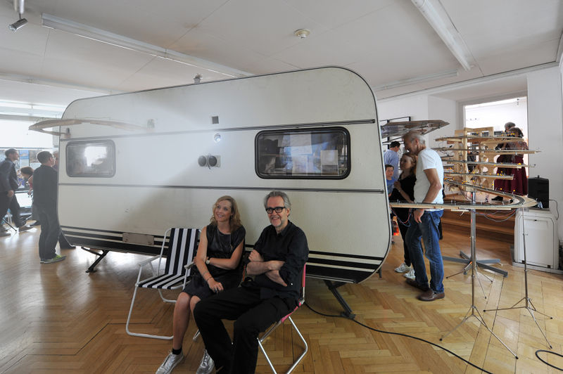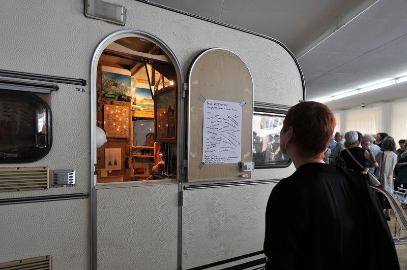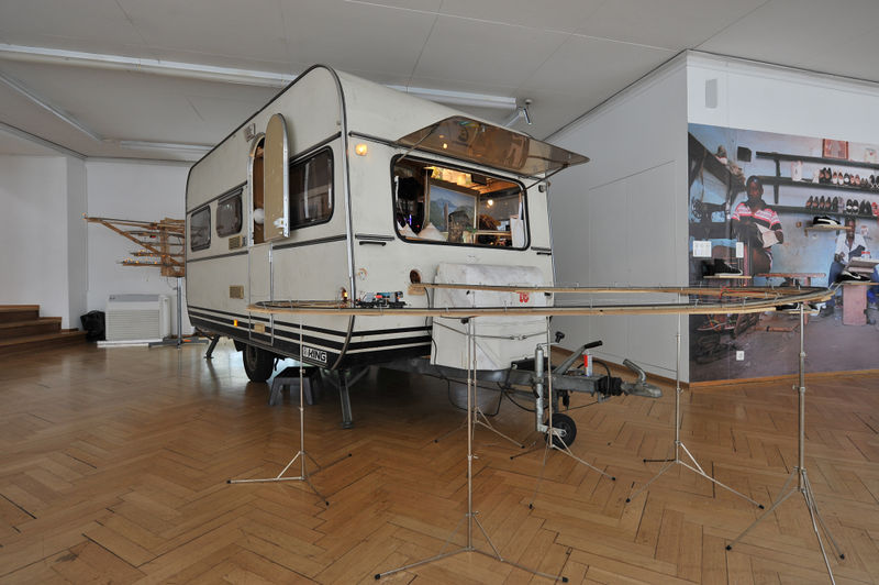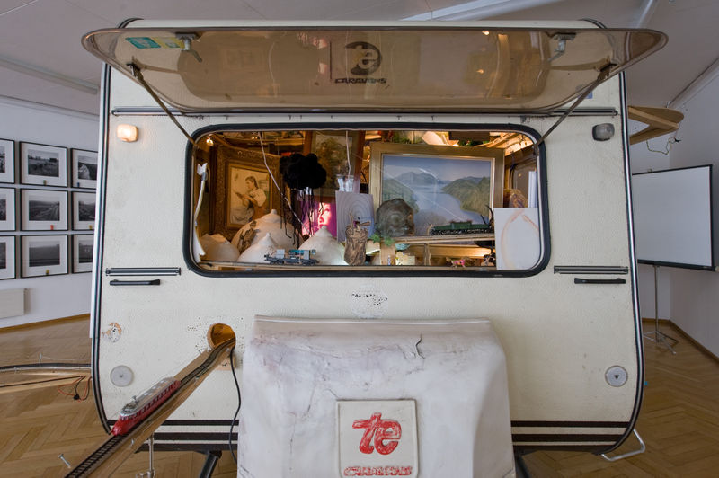 Sergej Klammer und Sandi Paucic hatten 2007 über 30 Kunstschaffenden angeboten, ihre in Lagerräumen und Ateliers über Jahre eingemotteten skulpturalen und installativen Arbeiten zur Gratis-Entsorgung zu überlassen. Die ansehnliche Lastwagenladung voll zu entsorgender Kunst wurde im Zürcher K3 Project Space 2007 bis unter die Decke auftürmt. Darüber, darunter und hindurch bauten Paucic und Klammer in monatelanger Arbeit eine grossflächige Modelleisenbahn-Strecke. Durch die so entstandene ‘Kunst-Landschaft’ wanden sich die Modell-Züge und übertrugen mittels aufgesetzter Kameras die Live-Bilder dieser ‘Kunstreise’ auf Bildschirme. 2008 ist K3 mit dem Nachfolgeprojekt des Trans K3 Express nach Rotterdam an das internationale Project(OR)-Festival eingeladen worden. Die Projekt-Autoren freuten sich zwar über die Einladung, mussten aber angesichts der zur Verfügung stehenden kurzen Aufbauzeit von nur 48 Stunden beinahe das Angebot ausschlagen. Doch dann kam die rettende Idee, den Kern der Anlage, also den Grossteil der Schienen und – - diesmal kleinen - Kunstwerke aber auch die komplizierte selbstgebaute Elektronik vorgängig in einen ersteigerten Wohnwagen einzubauen und mit diesem dann an die Vernissage nach Rotterdam zu fahren. Aus dem Wohnwagen heraus, seine Wände durchstossend, führen die Bahnstrecken auf Brücken und Steigspiralen in den öffentlichen Raum. Der Wohnwagen kann als eine analoge Bildmaschine verstanden werden: Wie ein übergrosser, altmodischer Filmprojektor wirft er die Bilder der Fahrt durch eine skurrile Wunderkammer der Kunst nach draussen auf eine Leinwand. 2010 kam die Einladung an die Swiss Art Awards in Basel, wo der die Züge sich nun durch einen Papierblätterwald von Pro Helvetia herausgegebenen Cahiers d’Artistes schlängelten und so das jüngere Schweizer Kunstschaffen ‘bereisten’. Für die Ausstellung ‘Voyage Voyage’ im Kunstmuseum Olten haben Sergej Klammer und Sandi Paucic den Wohnwagen nach sieben Jahren aus der Garage geholt und nun zusätzlich zu den Überbleibseln aller früheren Ausstellungen mit Werken des 19./20. Und 21. Jahrhunderts aus der Sammlung des Kunstmuseums Olten ausgestattet – die Kunstreise geht weiter! TK3E «Voyage, voyage! Über das Reisen in der Kunst» TransK3Express Kunstmuseum Olten im Aufbau. Vernissage: Freitag, 9. Juni, 18:30 Uhr Künstlergespräche: Dienstag, 20. Juni, 19:15 Uhr Sandi Paucic, Sergej Klammer Juni 2017 weitere Infos: www.kunstmuseumolten.ch SRF Kulturplatz 21.6.2017 Sommertipps (ab 7:10 bzw. 9:32) |